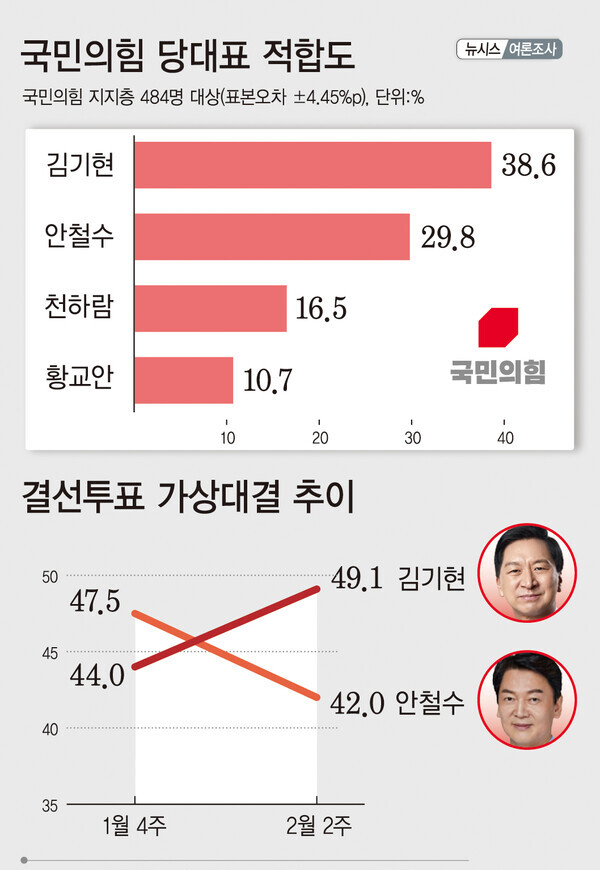 지난 11~13일 3일간 전국 만 18세 이상 남녀 1006명을 대상으로 한 결선투표 여론조사에서는 국민의힘 지지층 484명 중 38.6%는 김기현 후보가 본경선 진출자 4인중 차기 당대표에 가장 적합하다고 답한 것으로 나타났습니다. 반면 안철수 후보는 29.8%를 기록하여 이들간 격차는 8.8%포인트, 오차범위(±4.45%포인트) 내에서 앞서는 상황입니다.