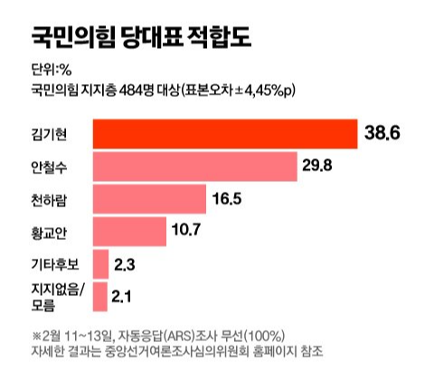 먼저 당대표 적합도 다자 구도에서 김기현 후보가 38.6%로, 안철수 후보(29.8%)를 제치고 1위를 차지했습니다. 친이준석계 천하람 후보는 10%대로 3위입니다.