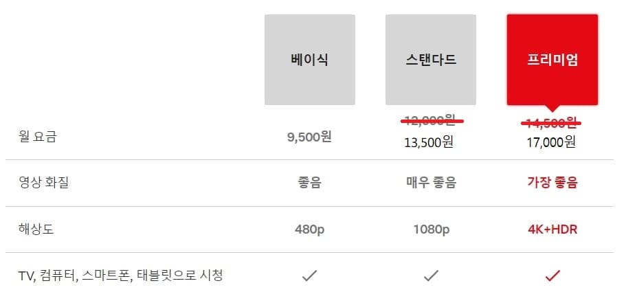 변경된 내용에 따르면 베이식 요금제는 월 9500원을 그대로 유지하였으나 스탠다드와 프리미엄 요금제는 각각 12.5%, 17.2% 오른 가격으로 바뀌었는데요, 베이식, 스탠다드, 프리미엄 총 3종류의 넷플릭스 요금제 가격과 특징을 좀 더 자세히 알아보도록 하겠습니다.