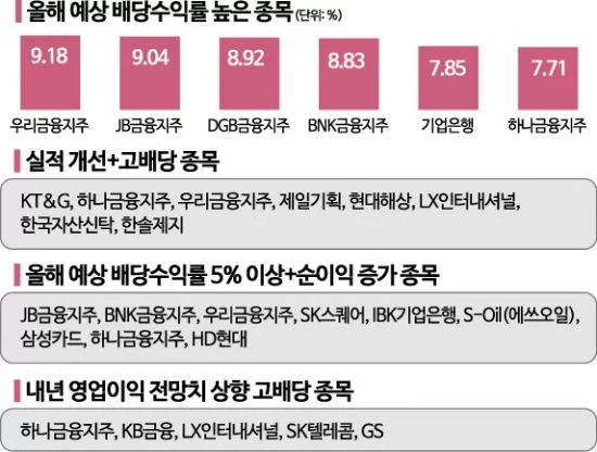 증권가에서는 코스피·코스닥 상장사 중 총 89개의 종목이 연말 5% 이상의 배당률을 기록할 것으로 전망하고 있는데요, 대표적으로 기아, HMM, HD현대, LX세미콘 등 제조업체와 하나금융지주, 우리금융지주, BNK금융지주, 현대해상 등 은행들, 삼성증권, NH투자증권, 유안타증권, 교보증권 등 증권사들이 5% 이상의 높은 배당률을 보일 것으로 예상되고 있습니다.