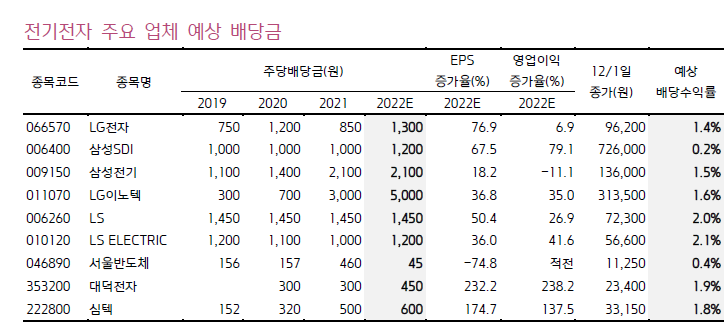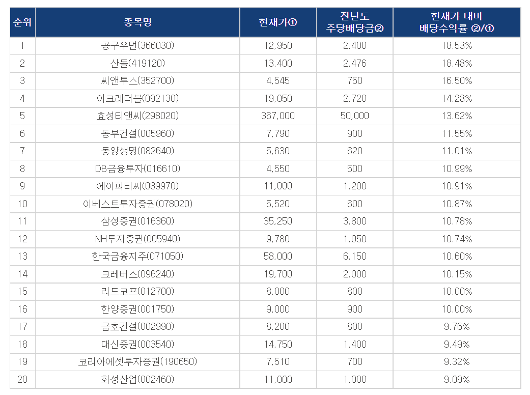 이들 종목 중에서 배당 수익률(주가 대비 배당금의 비율)이 10%가 넘는 종목들로는 11월28일 기준 효성티앤씨(14.04%), 동부건설(12.73%), 동양생명(11.44%), 금호건설(11.27%), NH투자증권(11.13%), 삼성증권(10.87%), 한국금융지주(10.87%) 등이 있습니다.