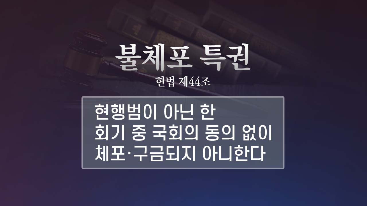 불체포 특권의 법적 근거는 헌법 44조에서 찾을 수 있는데요, ‘국회의원은 현행범인 경우를 제외하고는 회기중 국회의 동의없이 체포 또는 구금되지 아니한다’, ‘국회의원이 회기 전에 체포 또는 구금된 때에는 현행범이 아닌 한 국회의 요구가 있으면 회기중 석방된다’고 나와 있습니다.