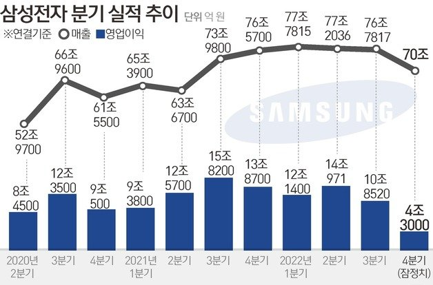 다만 삼성전자는 연간 기준으로 지난해 역대 최대 매출을 올렸다고 볼 수 있는데요, 2022년 연간 매출액은 301조7천700억원으로 전년보다 7.93% 증가했으며 연 매출이 300조원을 돌파한 것은 이번이 처음입니다. 참고로 지난해 연간 영업이익은 43조3천700억원이었는데 이는 전년 대비 16% 감소한 것입니다.
