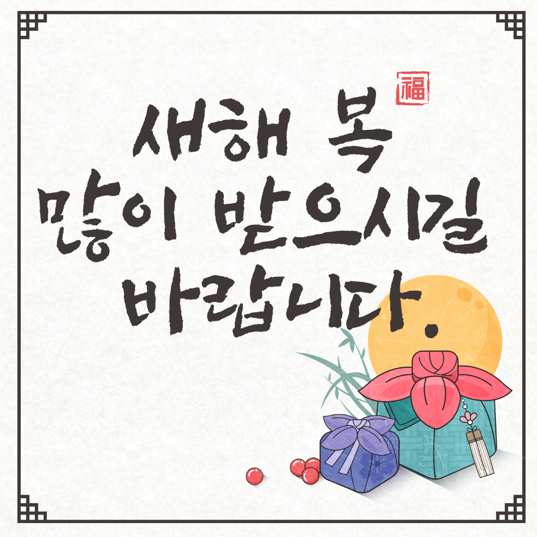 즐거운 명절 설날입니다. 설명절을 맞이하여 건강과 함께 밝은 한해, 가정에 행복이 가득하시길 기원합니다. 새해 복 듬뿍 받으세요.