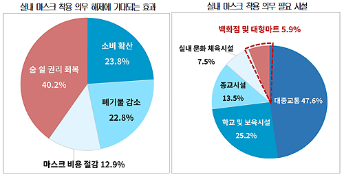 대한상공회의소가 국민 1666명을 상대로 실시한 여론조사에 따르면 국민 4명 중 3명은 실내 마스크 착용 의무 해제를 바라는 것으로 나타났다고 합니다. 응답자의 53.4%는 시설에 따른 단계별 해제를 원했으며 21.4%는 전면 해제를 희망했다고 하는데요, 반면에 현행 마스크 착용 의무를 유지하자는 의견은 24.8%가 나왔습니다.