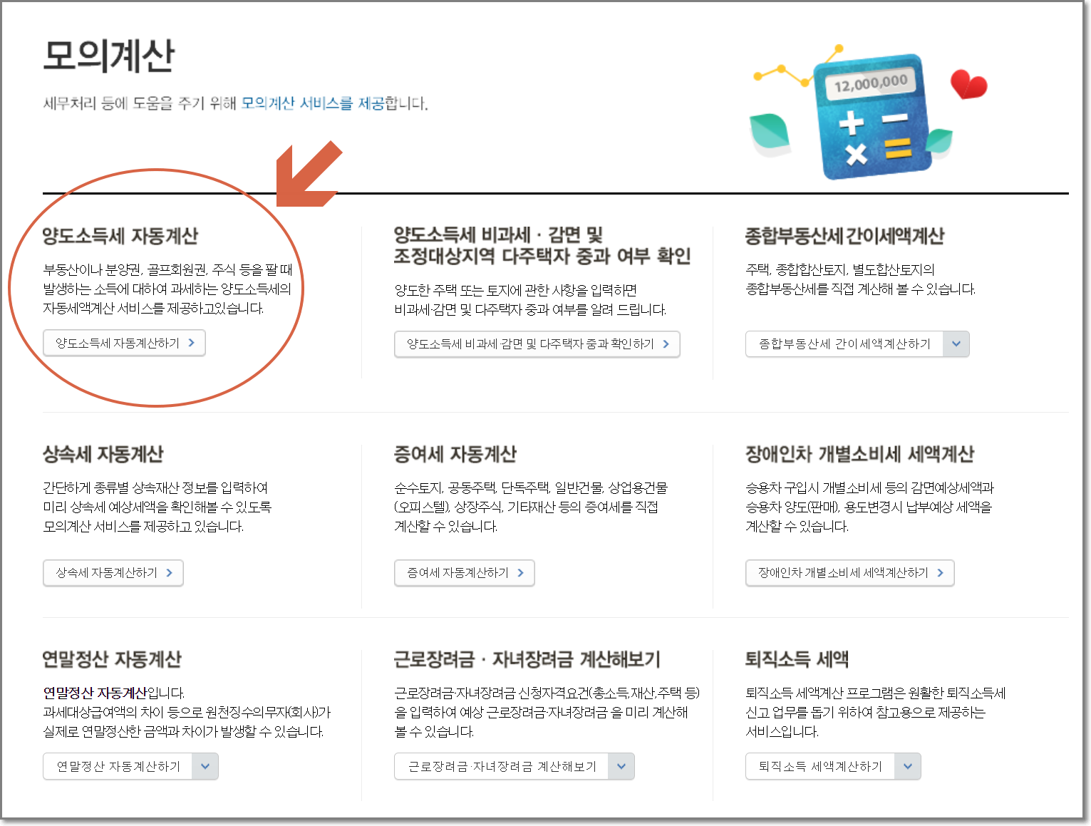 국세청 홈택스 - 우측상단의 모의계산 메뉴 - 양도소득세 자동계산하기 - 세금모의계산 항목에 양도가, 취득가, 양도일, 취득일 등을 입력 - 세액계산하기