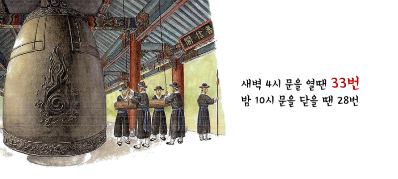 새벽에 치는 종을 '파루(罷漏)', 저녁 종을 '인정(人定)'이라고 하는데요, 파루는 오전 4시경에 통금 해제를 알리기 위해 33천(天)에 맞추어 33번을 쳤다고 합니다. 이후 도성 8개 문을 열어 하루를 시작한 것이예요.