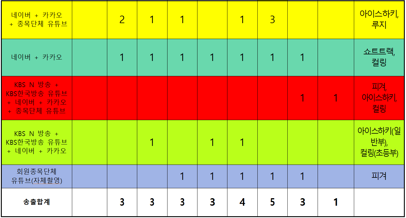 ●경기종목 : 빙상, 아이스하키, 스키, 바이애슬론, 컬링, 봅슬레이스켈레톤, 산악