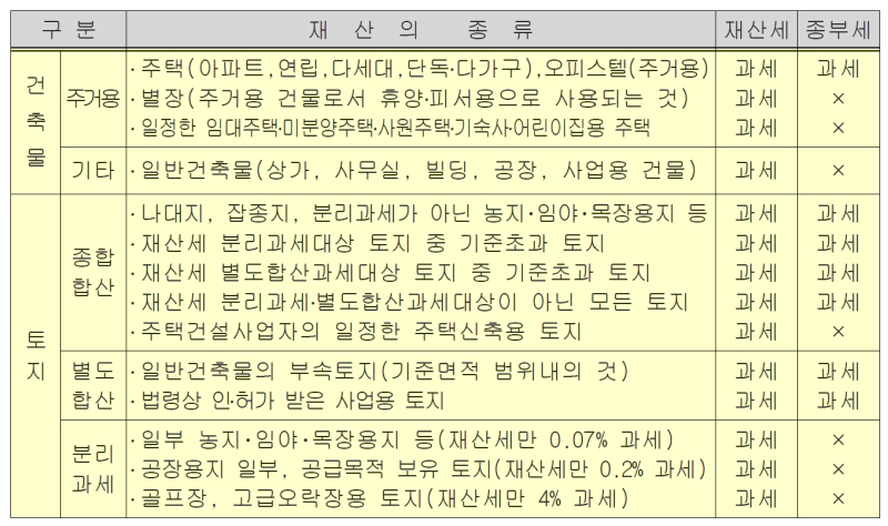 종부세 과세대상을 좀 더 상세하게 나누면 건축물도 주거용 또는 기타로 나눌 수 있고, 토지도 종합합산, 별도합산, 분리과세 등으로 나눌 수 있습니다.