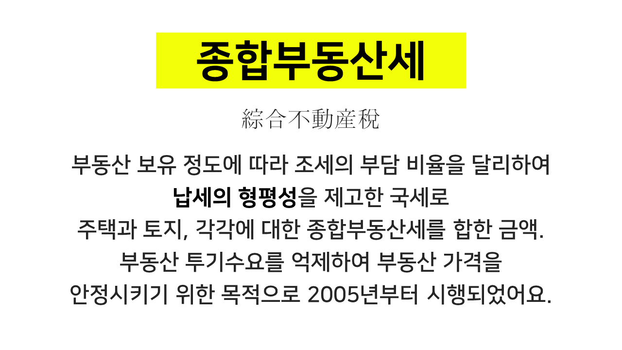 종부세는 종합부동산세의 줄임말로 쉽게 말하면 부동산 보유 정도에 따라서 조세의 부담 비율을 달리하는 국세라고 볼 수 있습니다. 즉 주택에 대한 종합부동산세와 토지에 대한 종부세를 합한 금액인 셈입니다.