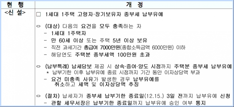 올해 달라진 점은 1세대 1주택자 중 일정한 요건을 갖춘 만 60세 이상 고령자나 5년 이상 장기보유자는 종부세 납부유예를 신청할 수 있다는 것인데요,