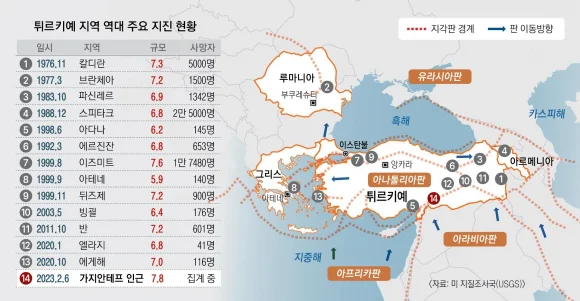 조사에 따르면 튀르키예 지진은 지난 25년 동안 규모 7.0 이상이 일곱차례 발생했다고 하는데요, 이번에 발생한 규모 수준의 지진은 전세계에서 연평균 5차례 미만 발생한다고 합니다.