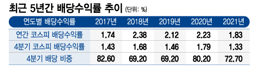 하지만 찬바람 불면 배당주라는 말이 무색하게 올해는 꾸준한 금리 인상 기조로 배당주의 매력도 떨어지는 분위기라고 하는데요, 연말 배당 규모가 줄어들 것이란 분석도 나오고 있어 배당주 매력이 많이 떨어진 것 같습니다. 알려드린 정보는 참고용이며 투자는 개인의 선택임을 강조드립니다.