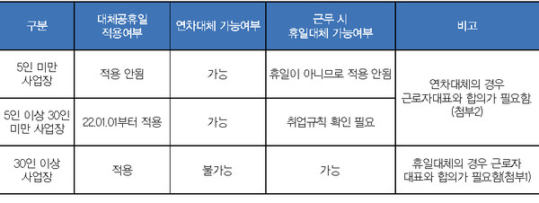 그러나 달라진 대체공휴일 적용대상은 근로기준법을 따르는데, 근로기준법 중 휴일 항목이 5인 이상 사업장만을 대상으로 하고 있기 때문에 2022년 1월부터 대체공휴일 적용대상은 5인 이상 기업에 한하며 이는 관공서 공휴일을 유급휴일로 보장받게 되었다는 말이 됩니다.