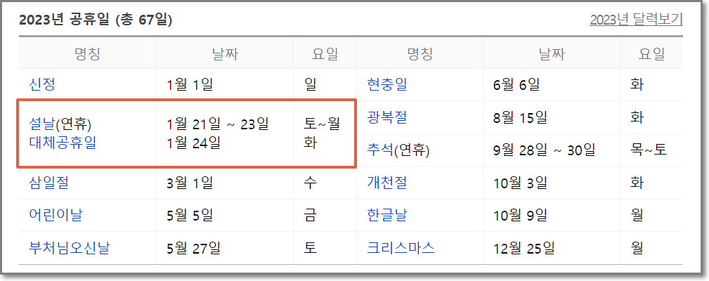 2023년 대체공휴일을 포함한 휴일은 총 67일입니다. 즉 2022년과 일수로만 따지면 같은거구요, 주 5일 근무제를 실시하는 곳을 기준으로 토요일을 포함하면 휴일 수는 116일이 됩니다. 이는 올해보다 2일 줄어 드는 것입니다.