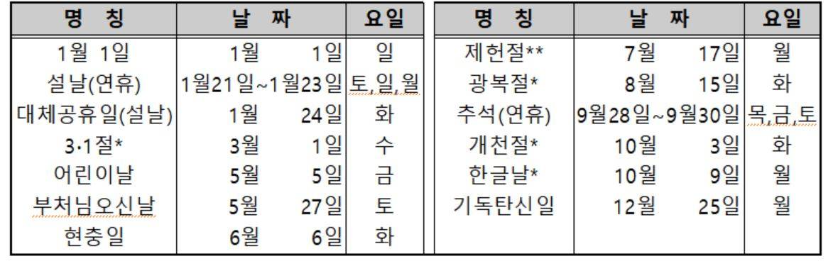 ▶ 설날 연휴 및 대체 공휴일(4일) : 1월21일(토)~24일(화)