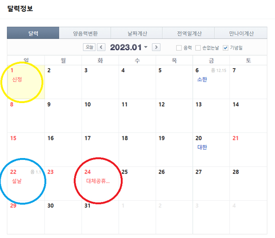 또한 오는 2023년 1월 1일(일)은 ‘신정’이지만 이날도 마찬가지로 대체공휴일 적용대상이 아니기 때문에 1월 2일(월)은 평일로 적용되며 2023년 1월 22일(일)만 ‘설날’이기 때문에 1월 24일(화)이 대체공휴일이 되는 것입니다.
