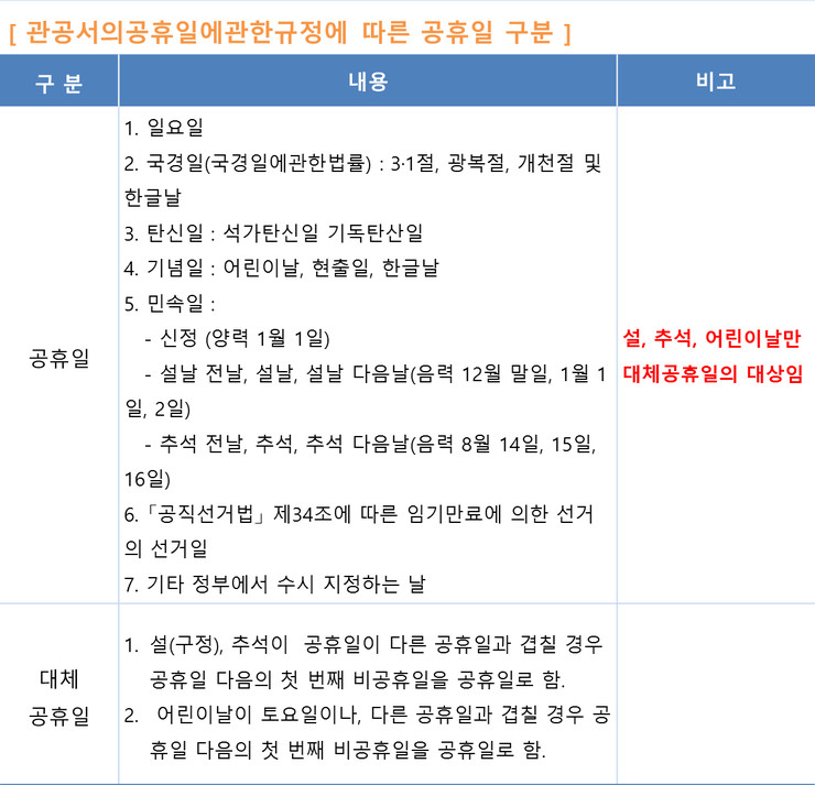 이처럼 2021년부터 시행된 '공휴일법'이 제정되기 전에는 '관공서의 공휴일에 관한 규정'이라고해서 공무원과 공공기관 등에만 적용 대상이 한정되었는데요, 공휴일법에서는 모든 국민에게 동일하게 휴일을 보장하겠다는 취지로 대체공휴일 적용대상을 확대했습니다.
