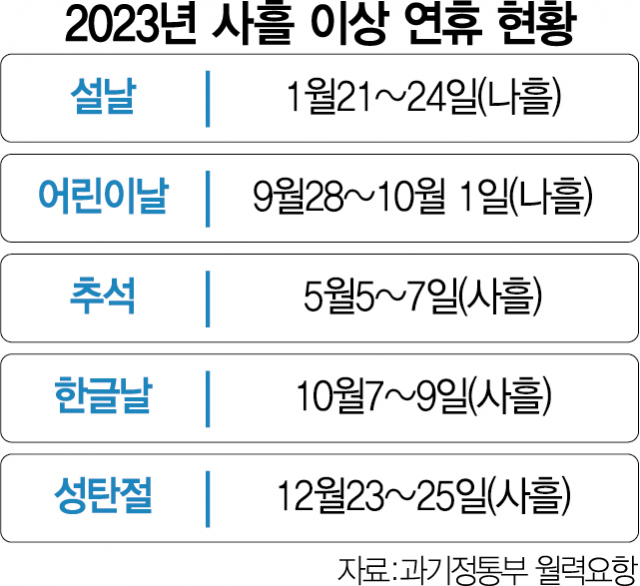 대신 2023년에 3일 이상 연속으로 쉴 수 있는 휴일을 세어보면 다섯 번이 있는데 다음과 같습니다.