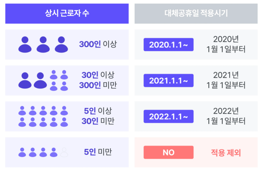 그러나 달라진 대체공휴일 적용대상은 근로기준법을 따르는데, 근로기준법 중 휴일 항목이 5인 이상 사업장만을 대상으로 하고 있기 때문에 2022년 1월부터 대체공휴일 적용대상은 5인 이상 기업에 한하며 이는 관공서 공휴일을 유급휴일로 보장받게 되었다는 말이 됩니다.