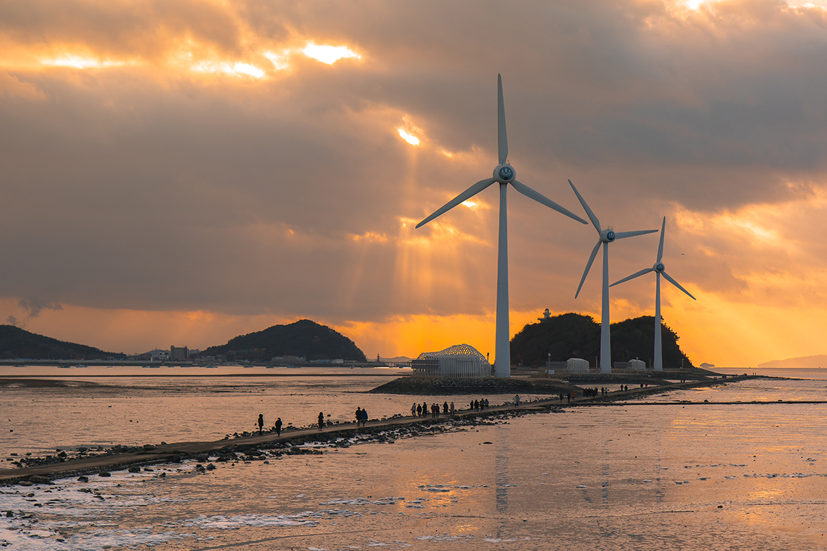 서해안에서는 바닷길에서 해넘이를 볼 수 있는 곳으로 대부도 남쪽 끝 탄도항을 추천합니다. 풍력발전기와 어우러지는 노을의 풍경이 유럽같은 이국적인 느낌을 주는데요, 하루에 딱 두 번만 열린다는 한국판 '모세의 기적'이 펼쳐져 누에섬까지 걸어갈 수 있습니다.