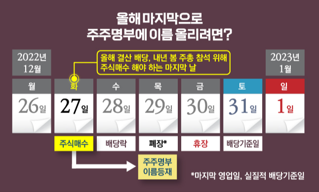 2022년은 배당락일이 28일인데요, 배당 투자에는 배당금이 얼마나 나올지 알 수 없다는 위험요소가 있어 주의가 필요하다는 것이 전문가들의 조언입니다. 배당금을 받으려면 배당 기산일인 12월 31일에 그 회사 주주여야 하지만 배당금이 확정되는 시점은 다음해 3월이기 때문입니다.