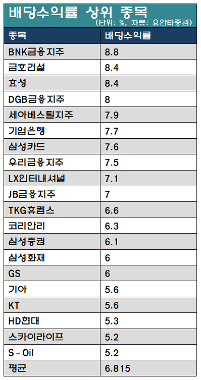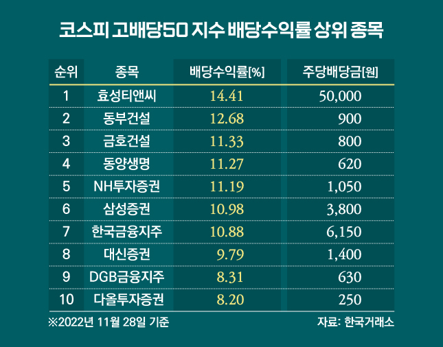 이들 종목 중에서 배당 수익률(주가 대비 배당금의 비율)이 10%가 넘는 종목들로는 11월28일 기준 효성티앤씨(14.04%), 동부건설(12.73%), 동양생명(11.44%), 금호건설(11.27%), NH투자증권(11.13%), 삼성증권(10.87%), 한국금융지주(10.87%) 등이 있습니다.